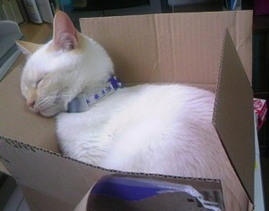 | 最近困るのが愛猫が「紅茶BOX」の上で寝るようになった事 太陽の出ている間は窓際でうたた寝しているのですが 日が沈んで私が寝るまでの間のうたた寝場所は紅茶BOXにした模様。 (本寝は私のベッド。) 確かにハンモックに似ているのかもしれませんが・・・(; ゚д゚) でも仕事から帰って風呂入って一息・・・と紅茶を飲む時間には 既にここで寝ている。最初に飲みたい紅茶の袋を取っておけばいいのだが そう計画通りにいつも動くことはできず 仕方なく水を飲むのであった。(水の方が体にいいからいいけど、一杯くらい飲ませてくれよw)